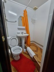 Совмещенный санузел с душем оборудован унитазом, раковиной, полотенцесушителем, зеркалом.