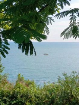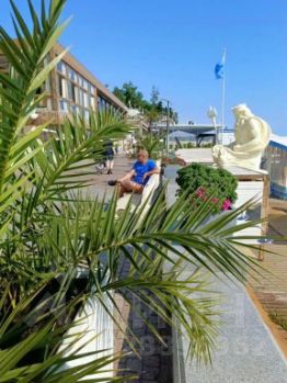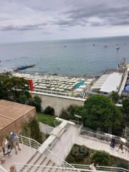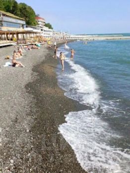 Квартира рассчитана на размещение 12 человек. В комнате — двуспальная кровать, на лоджии — диван и стол. Санузел совмещенный, кухня отдельная. Из окон открывается вид на море.