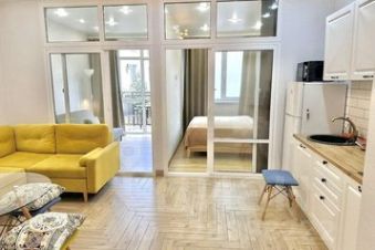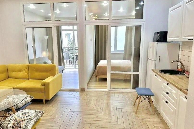 Квартира расположена рядом с началом променада для прогулок вдоль моря и расположена рядом с набережной реки Мзымта, которая впадает в море.