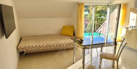 Много света. Панорамные окна в пол в гостиной, два окна в спальне и редкое для Сочи мансардное окно в ванной - это очень приятно, не нужно включать свет днем). Большой балкон 2х2,2м с прекрасным перспективным видом.