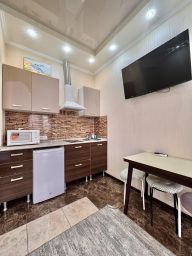В каждой квартире есть все, что нужно для комфортного проживания: спальные места, постельное белье и полотенца, по количеству гостей в номере! Wi-Fi, кондиционер, полностью оборудованная кухня с обеденной зоной, всей техникой и посудой!!! телевизор, кондиционер собственная ванная комната с душем и феном, микроволновая печь, холодильник, плита и чайник.