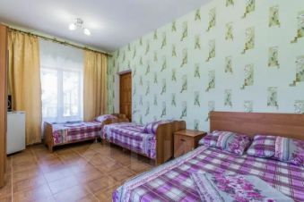 Четырехместный стандартный номер площадью 20 кв.м с видом во двор. Подходит для размещения 4 человек. Имеет спальню с приятным интерьером. В номере одна двуспальная кровать, две односпальных кровати, телевизор, кондиционер, шкаф, вешалка, холодильник, стулья. Ванная комната: душ, раковина, туалет. В стоимость входит: Постельное бельё, полотенца, мыло. WI-Fi бесплатно на всей территории.