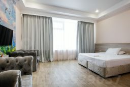 Номер Делюкс площадью до 24 км м, с видом на море отличный вариант, как для бизнес гостей, так и для романтических пар. В каждом номере: одна большая кровать, ванная комната с душевой кабиной, фен, полотенца, наличие большого зеркала в ванной комнате, косметические средства, тапочки, рабочее место(стол), звуконепроницаемые окна, высокоскоростной WI-FI, телефон, телевизор с плоским экраном, кондиционер, холодильник, чайник и чайный набор, столик. Наличие нескольких комбинированных источников освещения (потолочное, настольное, прикроватное и пр.).Ранний заезд и поздний выезд по требованию. К услугам гостей служба Room Service 24 часа.