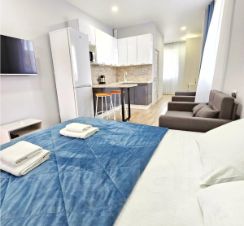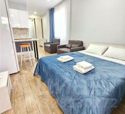В апартаментах есть есть двухспальная кровать и два односпальных кресло-кровати, кабельное тв, wi-fi, холодильник, кухня оборудованная под ключ со всем необходимым, душ, туалет, стиральная машинка, кондиционер, шкаф, балкон с летней мебелью.