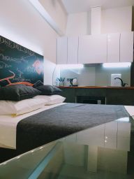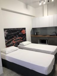 Номер категории "Делюкс TWIN" представляет собой уютные апартаменты площадью 21 кв.м. с двумя односпальными кроватями и мини-кухней. Оснащение и комплектация: TV, сплит-система, холодильник, варочная панель, вытяжка, СВЧ-печь, чайник электрический, душевая кабина, душ, полотенцесушитель, фен, посуда и столовые приборы, утюг, вешалки для одежды, шторы blackout, утюг и гладильная доска общего пользования (на этаже).