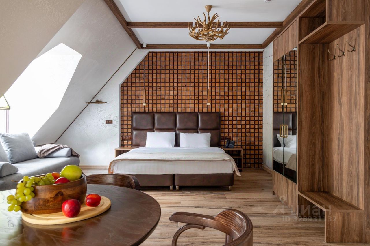 Потолки с массивными деревянными балками и рельефные изголовья кроватей подчеркивают природную эстетику, создавая аутентичную атмосферу горного шале.