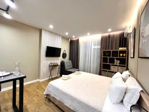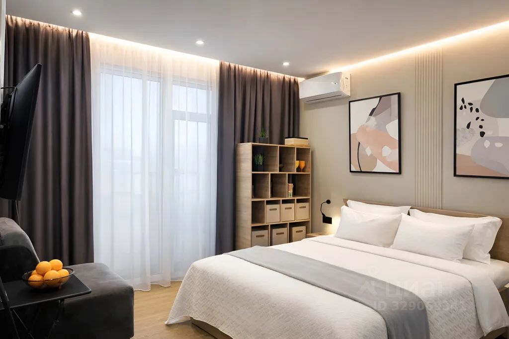 Спальная зона: двуспальная кровать с ортопедическим матрасом, удобное кресло-кровать (раскладывается в дополнительное спальное место), вместительный шкаф, плотные шторы.