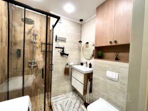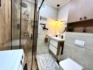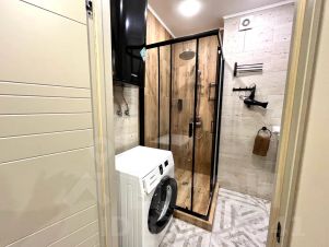 Санузел с душевой, гигиеническим душем, феном, стиральной машиной и тёплым полом.