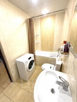 В квартире есть всё необходимое для комфортного проживания: кондиционер, большой диван-кровать, телевизор, холодильник, чайник, газовая плита, посуда для сервировки и для приготовления пищи, стиральная машина.