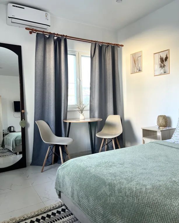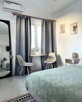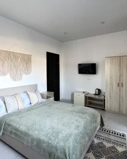 Этот номер подойдет для семейной пары или друзей, так оснащен двуспальной кроватью или двумя односпальными кроватями, которые по запросу могут быть соединены в одну общую. Дополнительно в номер можно поставить доп. кровать для ребенка. В номере есть шкаф для одежды, тумбочки, стол, ТВ, холодильник, чайник и сплит-система. Номера расположены на первом этаже, имеют отдельный вход. В каждом номере санузел с душевой. Возле номера имеется садовая мебель. Номер подходит для размещения с питомцем.
