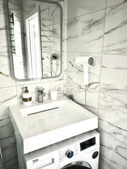 Есть всё необходимое для комфортного отдыха (стиральная машинка, водонагреватель на случай, если отключат горячую воду, микроволновая печка, чайник, утюг, индукционная варочная панель, высокий встроенный холодильник, набор необходимой посуды и т. д.).