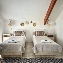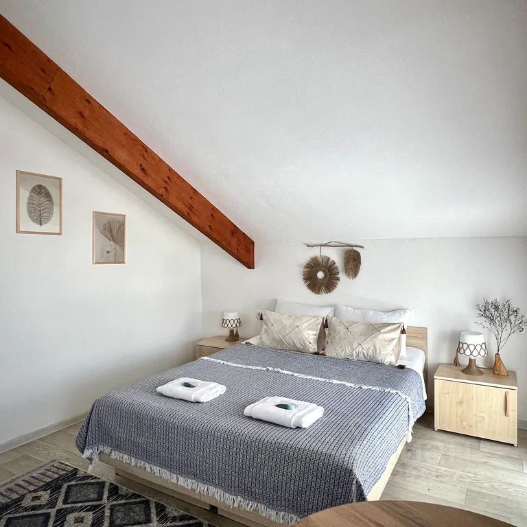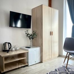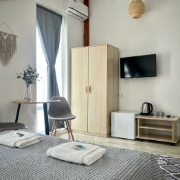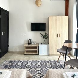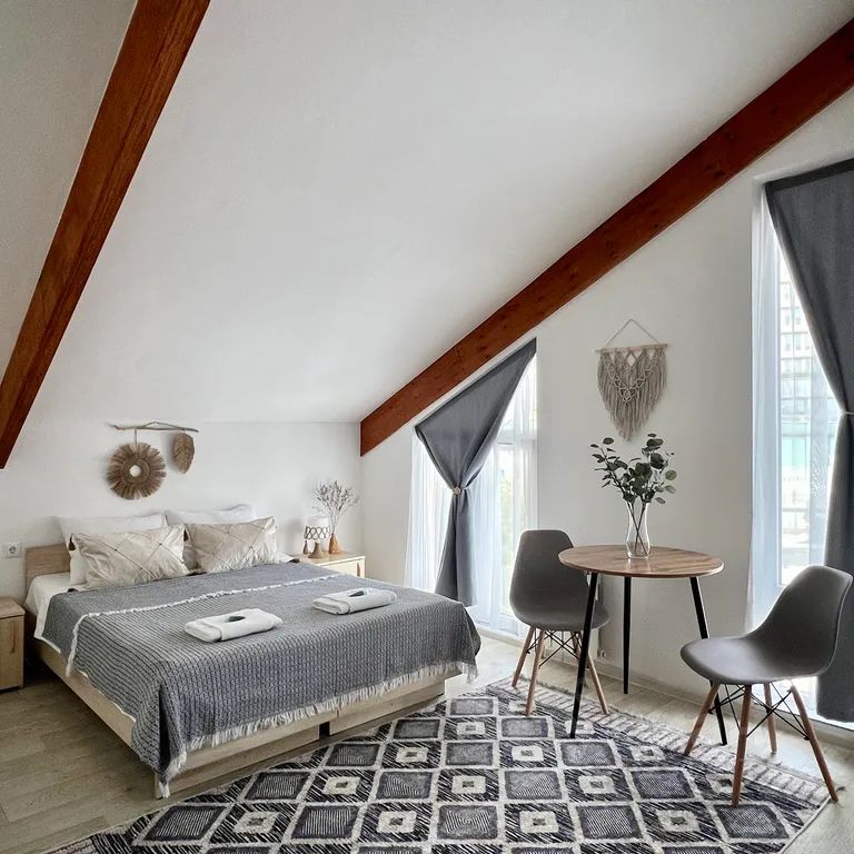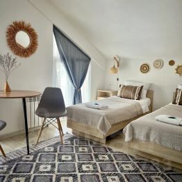 Этот номер подойдет для семейной пары или друзей, так оснащен двуспальной кроватью или двумя односпальными кроватями, которые по запросу могут быть соединены в одну общую. В номере есть шкаф для одежды, тумбочки, стол, ТВ, холодильник, чайник и сплит-система. Номера расположены на третьем мансардном этаже. В номерах собственный санузел с душевой.