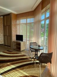В больших просторных номерах с балконом гости будут чувствовать себя свободно и уютно, прекрасный бассейн взбодрит в начале дня, столовая на территории порадует вкусной домашней кухней, а в гриль-баре вы сможете отведать блюда из мяса и рыбы от нашего шеф-повара. Дети смогут провести время на детской площадке.