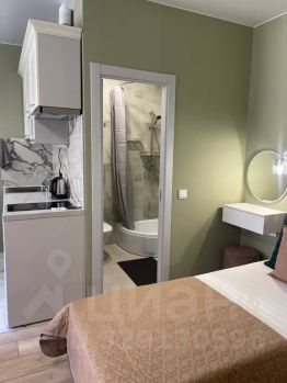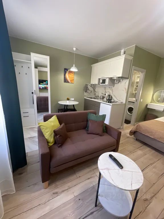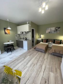 Удобные, уютные апартаменты в красивом месте! В студии имеется спальные места, дополнительно диванчик, кухня со всем необходимым для приготовления пищи, чайник электрический, холодильник, свч, плита индукция, стол стулья, посуда вся необходимая. Шкаф для одежды, комод, телевизор, кондиционер, прихожая зона: шкаф с зеркалом, вешалка. Обувница. Ванная комната оснащена душем, туалет, раковина и стиральная машинка! Фен, предметы гигиены, шампунь, гель для душа и мыл! Все бельё постельное и полотенца меняются периодически! Тапочки. Приветственные чай кофе! Ждём в гости!