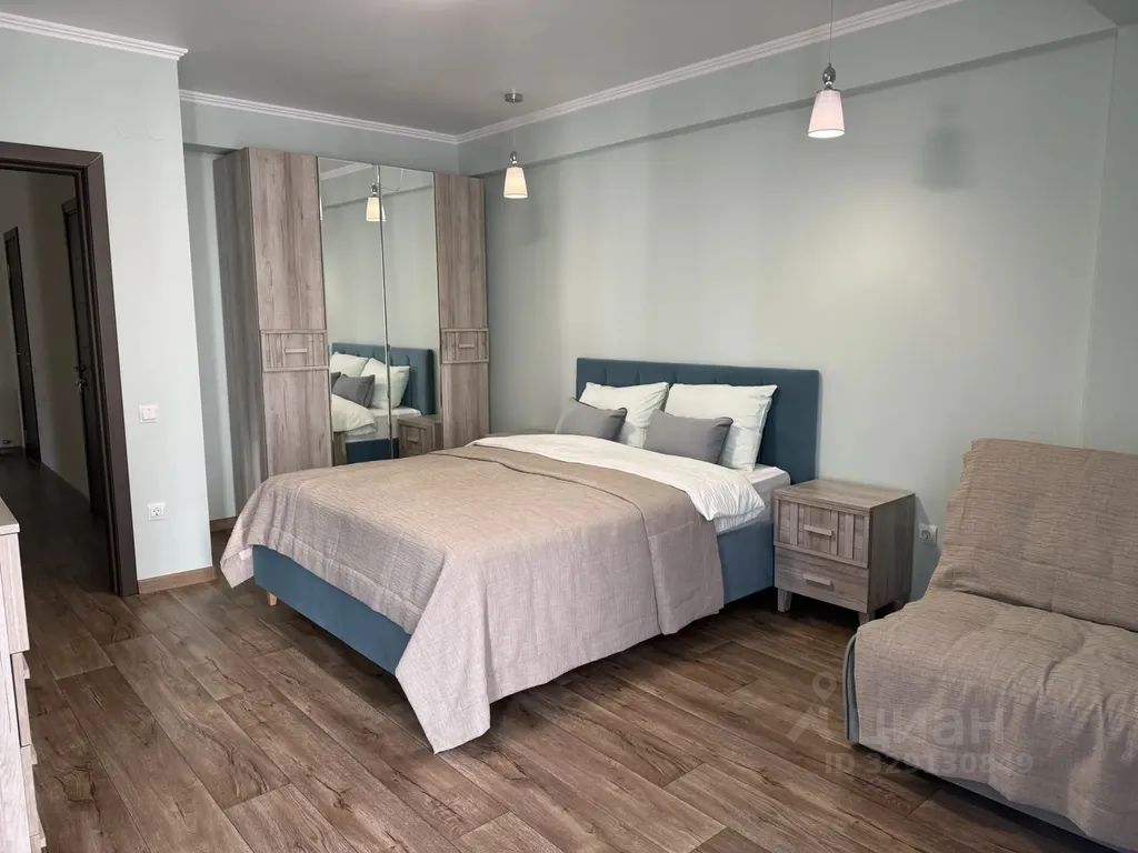 В гостинной установлена сплит-система и телевизор, а также имеются две вместительные гардеробные для хранения вещей. В каждой спальне - большая двуспальная кровать, тумбочки и шкафы, сплит-системы, телевизоры, раскладные диваны на двух человек. Комнаты настолько просторные, что можно свободно разместить 6-8 человек.