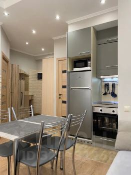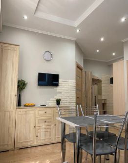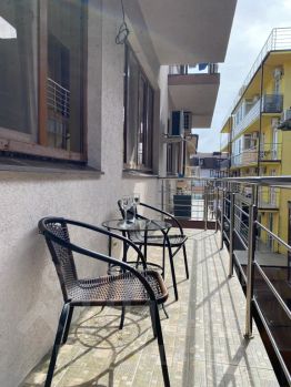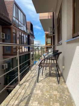 Квартира отлично подойдёт как для семей с детьми, так и для комфортного проживания 5 взрослых человек. Состоит из прихожей, кухни-гостиной и отдельной спальни с большим балконом для отдыха. В гостиной расположен раскладывающийся диван, в спальне двуспальная кровать и раскладывающийся диван. В каждой комнате имеются телевизор и кондиционер. Есть фен, стиральная машина, сушилка, утюг, гладильная доска. На кухне набор посуды, сковорода, кастрюли, чайник, тостер, холодильник, микроволновка и электрическая плита. При заселении предоставляется комплект полотенец для каждого гостя. Минимальный период проживания 4 суток. Стоимость проживания зависит от сезона и длительности проживания. При длительном проживании возможен торг.