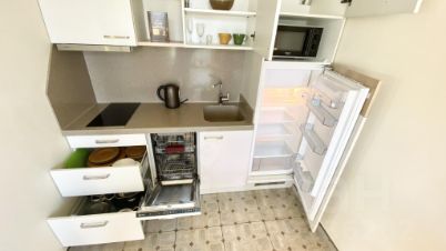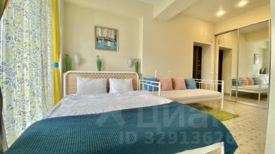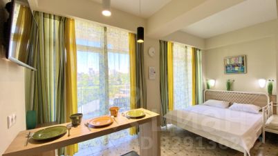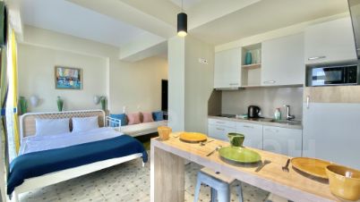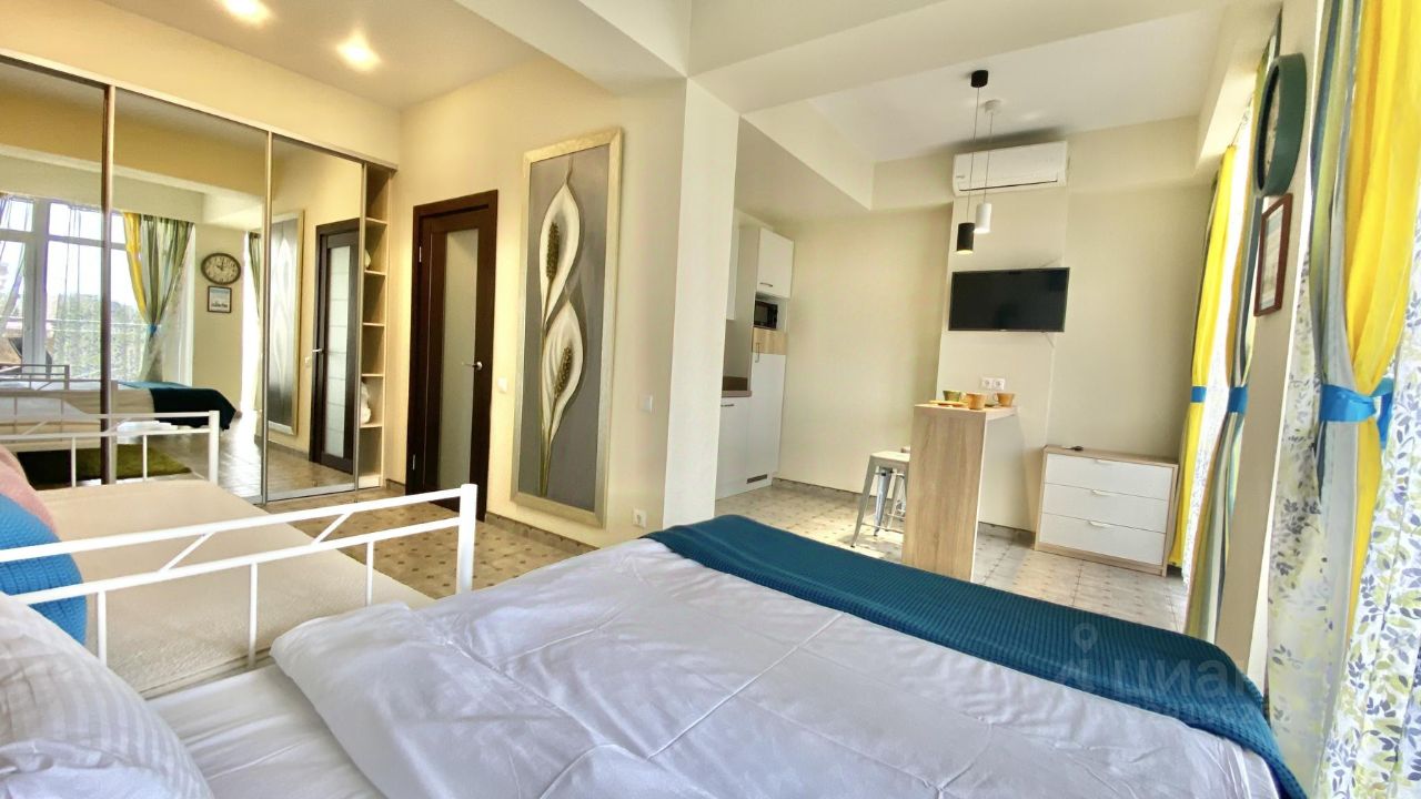 Кухня-студия: кухонный гарнитур с полным набором, барный стол, 3 стула, эл. чайник, микроволновка, варочная панель, посудомоечная, холодильник, полотенце, WiFi, тв, кондиционер, двуспальная кровать, односпальная тахта. Балкон с видом на море, уличная мебель, 2 лежака. Санузел: душевая зона, фен, утюг, стиральная машина. Прихожая, шкаф-гардероб: полки, вешалки, декор.