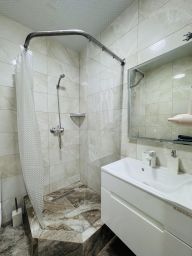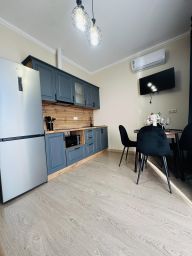 Полноценная кухня оборудованная всем необходимым: чайник, варочная панель, холодильник, микроволновая печь, набор посуды, кондиционер, столовые приборы, обеденная зона, выход на балкон. Просторный санузел: стиральная машина, порошок, шампунь, гель для душа, комплект полотенец для всех гостей. Утюг, фен и сушка для белья, шкаф и комод для хранения, Wi-Fi