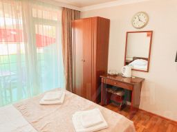 4-х местный номер категории "Комфорт" с балконами - просторные уютные однокомнатные номера со всеми удобствами. В каждом номере телевизор, кондиционер, шкаф, туалет, душ, холодильник, фен. Номера данной категории имеют балконы. На балконах для комфорта отдыхающих есть столик и стулья.