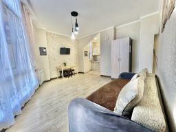 Квартира с кухней гостиной и одной спальней находится в жилом комплексе "Дельфин у моря", который расположен в центре Адлера, в пешей доступности от центрального пляжа.