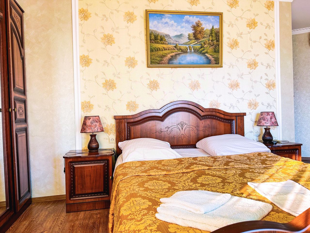 Спальные места: двуспальная и диван.