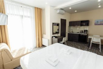В Номере: Одна двуспальная кровать размера "King-size", балкон, бесплатный Wi-Fi, Сейф, кондиционер, телевизор с плоским экраном, спутниковое телевидение, стулья, письменный стол, косметическое зеркало, чайник, чайный набор, шкаф для одежды, вешалки, гладильная доска, утюг, микроволновка, мультиварка, набор посуды, минибар, ковровое покрытие, панорамные окна, высокие потолки, электронные замки.