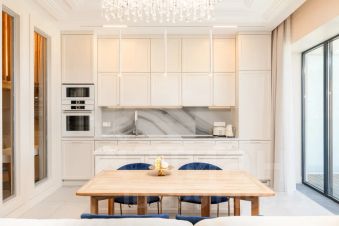 Дизайнерский ремонт в стиле современной классики: минимализм, натуральные материалы, панорамное остекление. Всё готово к жизни — мебель, техника, посуда. Чистота, свет и простор.