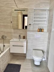 -Первая сдача. Ремонт из высококачественных материалов. Экологически чистый пробковый пол, мебель европейских изготовителей. Удобный трехспальный диван, раскладывающийся в несколько позиций и раскладной двуспальный диван.
