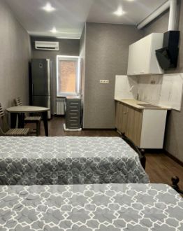 В квартире выполнен евроремонт, что создаёт современную и приятную атмосферу. Пространство студии грамотно организовано: в комнате есть вся необходимая мебель, а также установлены кондиционер и телевизор. Кухня оборудована холодильником, что позволяет с удобством готовить и хранить продукты. В ванной комнате установлена душевая кабина, поэтому можно расслабиться после насыщенного дня. Также имеется стиральная машина, что делает повседневную жизнь ещё более комфортной.