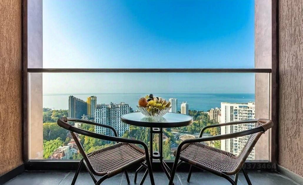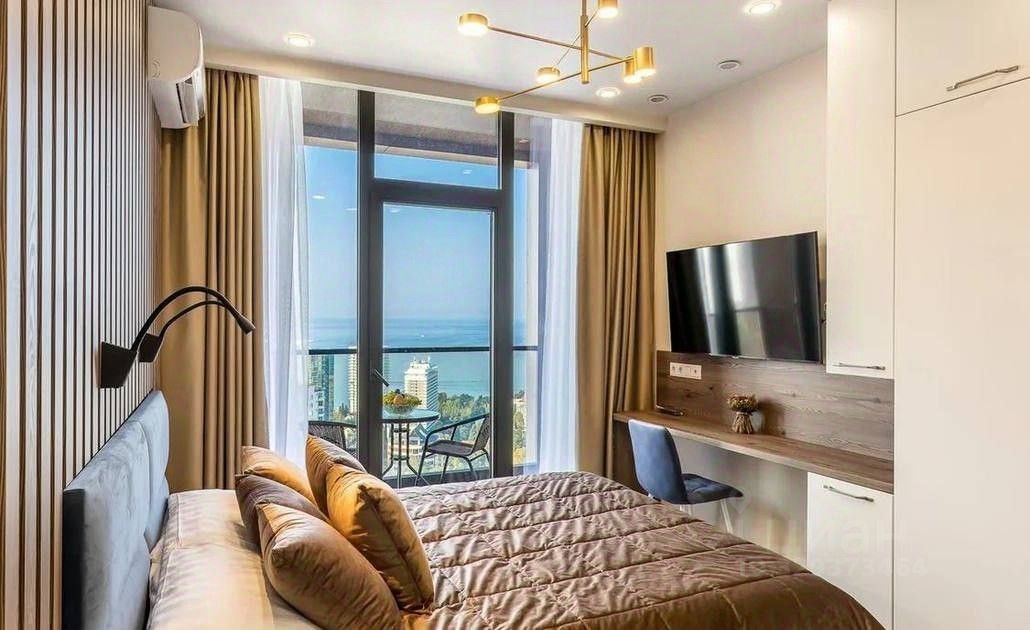 Прекрасная квартира-студия в жилом комплексе "Метрополь" в районе Светлана (центральный Сочи) с бассейном на крыше и панорамными видами на море, горы и город Сочи.