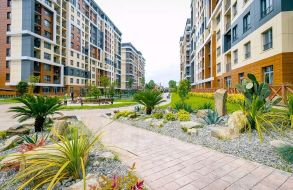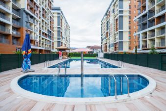 5. Закрытая территория жилого комплекса: подогреваемый бассейн (отдельная оплата), кафе, детские площадки, спортивная зона и зона воркуют. Парковка открытая рядом с жилом комплексом. Также рядом с комплексом есть платная парковка.