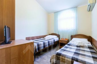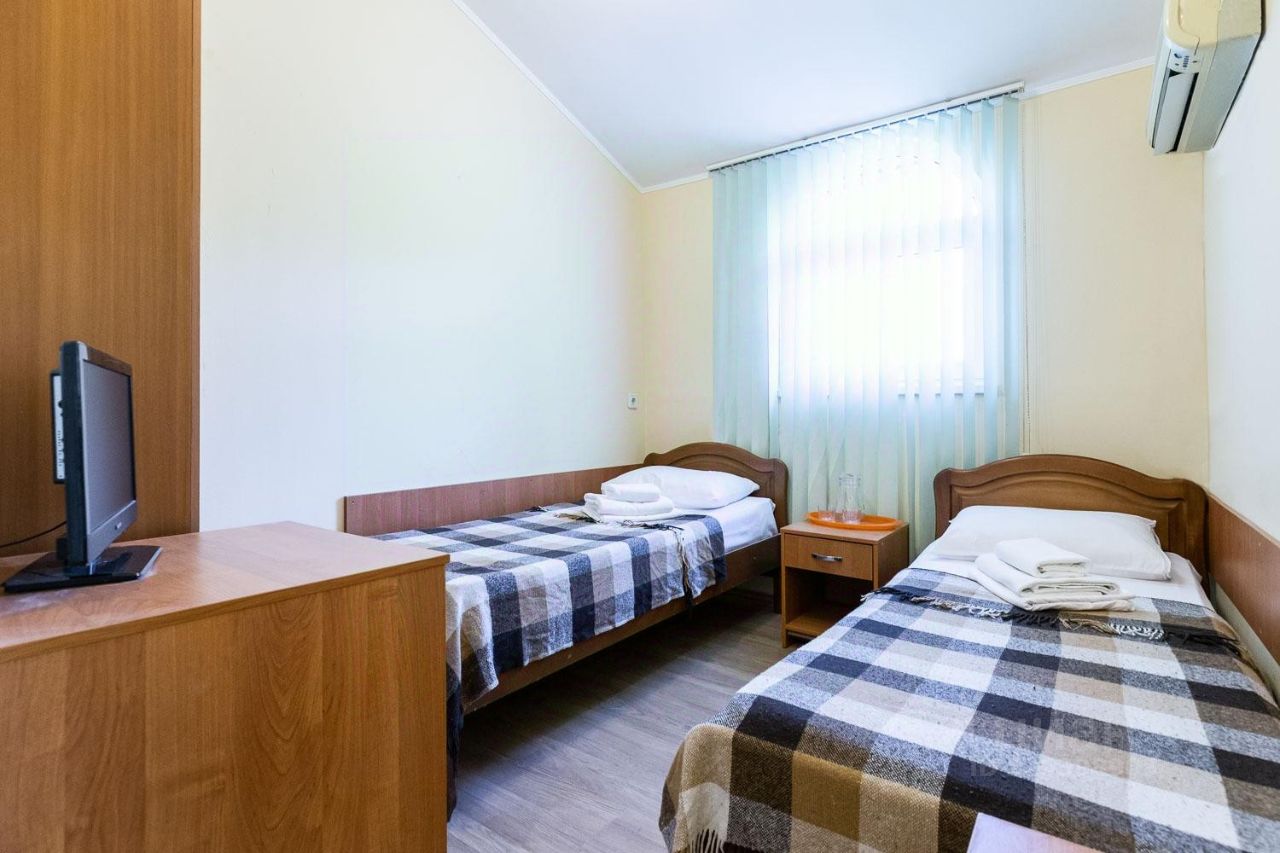 12 кв.м, две 1-спальные кровати, КД, холодильник, ТВ, ванна, функциональная мебель. Номера расположены на мансарде 6 этаж (лифт до 5 этажа, затем один этаж пешком). Часть номеров с видом на море, часть - с видом на горы