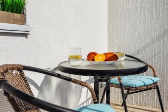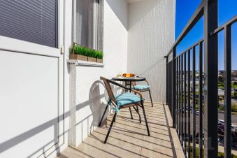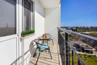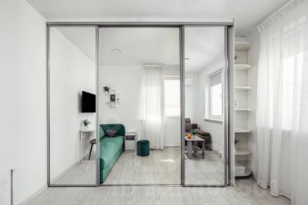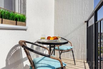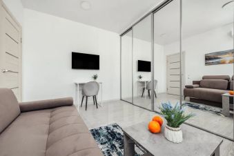 В спальной зоне расположена удобный и комфортный диван-кровать комфорт класса, Smart TV, рабочий стол. Зонирована перегородкой на вторую комнату, где так же расположен диван-кровать, шкаф и выход на балкон, где можно посидеть с чашечкой кофе с шикарным видом.