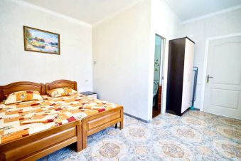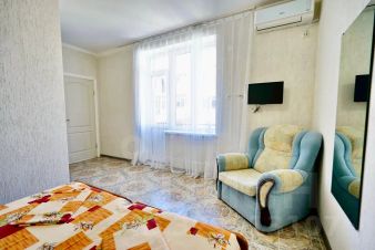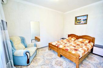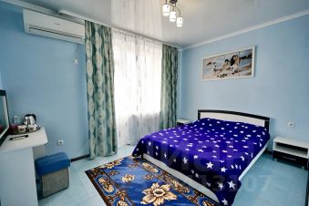 Кровати две односпальные или одна двуспальная кровать, прикроватные тумбы, стол, стулья, шкаф, вешалки, зеркало, постельное белье, полотенца, телевизор, интернет кабельное, кондиционер, холодильник, санузел совмещённый.