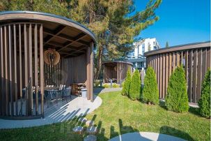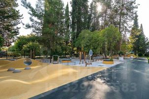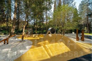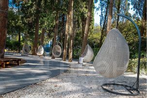 - Детская площадка с качелями, слуховыми трубами, холмами с мягким покрытием, верёвочным парком и креслами-коконами