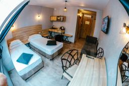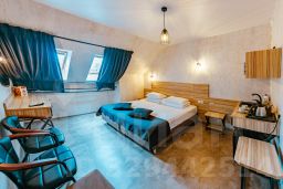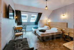 Номер в стиле лофт. Мансардные окна, вид на крыши, город и небо. Пол- плитка. 2 отдельные кровати (трансформер)+ раздвижной диванчик. Небольшой кухонный уголок: минибар, СВЧ, чайник, раковина, чашки. В номере ЖК-телевизор, сплит-система, система "теплый пол", рабочая зона, журнальный столик, 2 стула, кресло, кондиционер, шкаф, полка для багажа. В ванной комнате душевая кабина, фен.