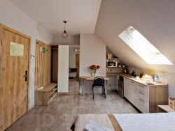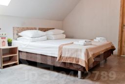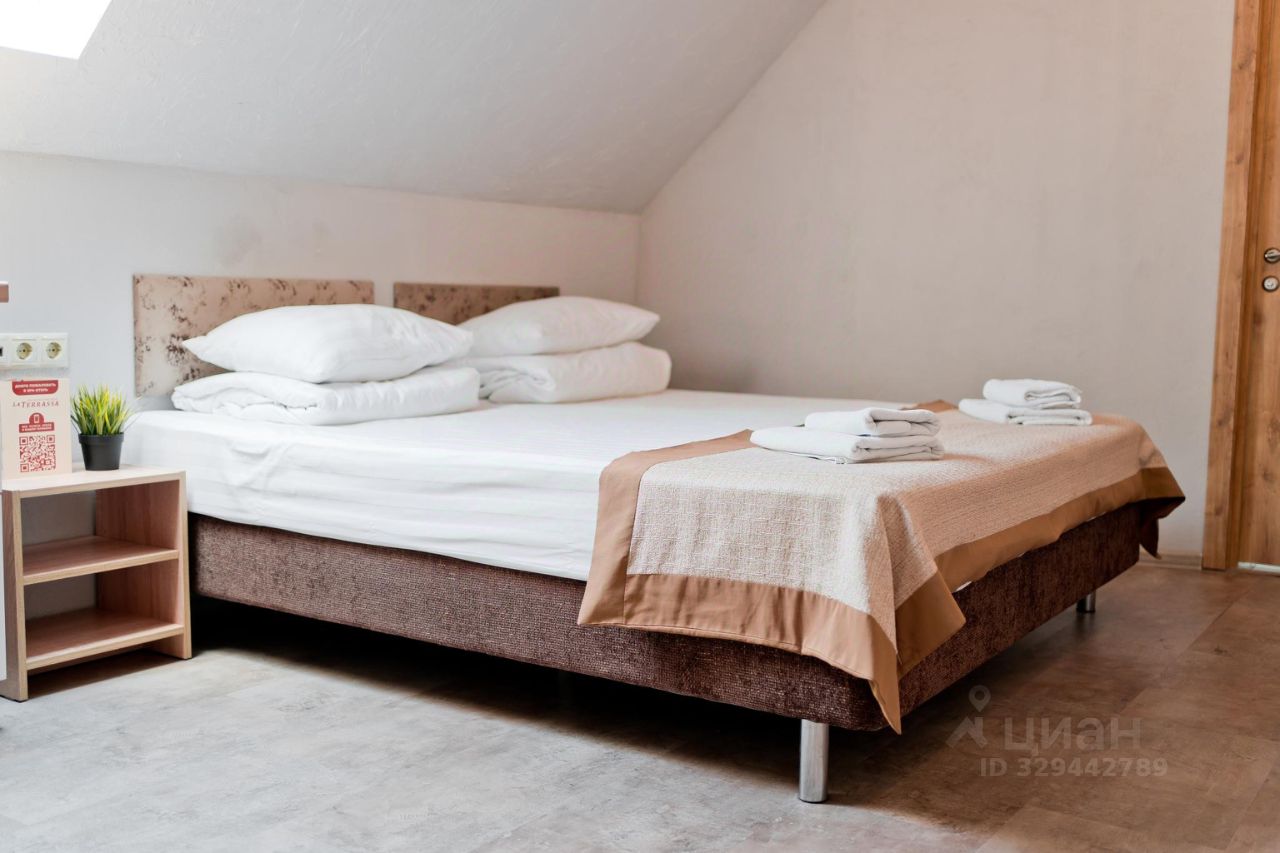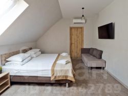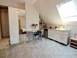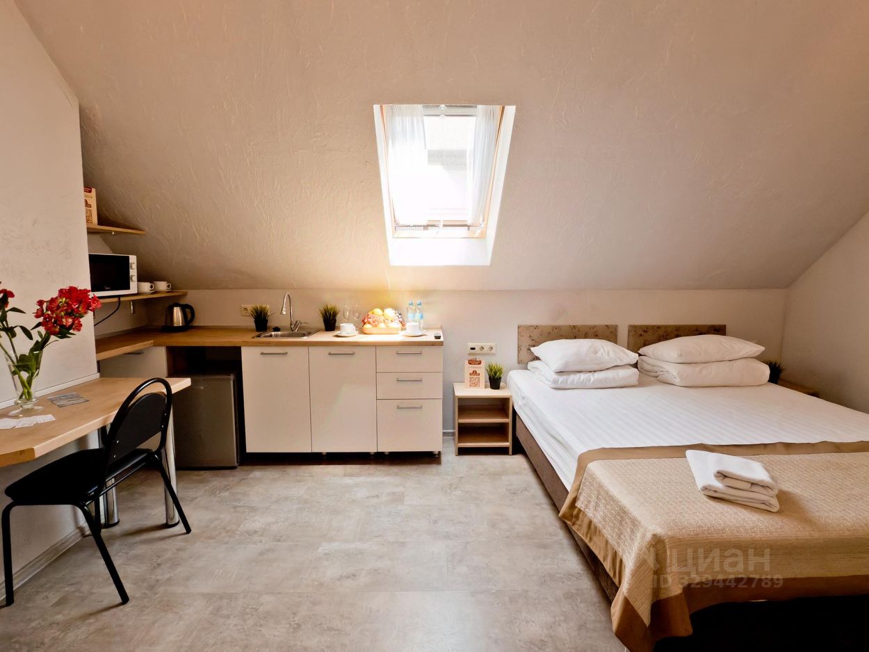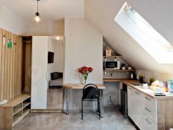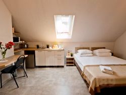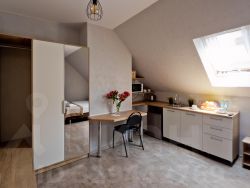 Мансардный номер в современном стиле. Пол плитка. 2 односпальные кровати или одна большая 2хспальная кровать + раздвижной диванчик. Мансардное окно, вид на крыши и небо. В некоторых номерах- студиях есть балкон с прекрасным видом на Сириус и горы.