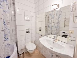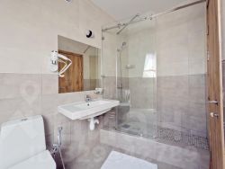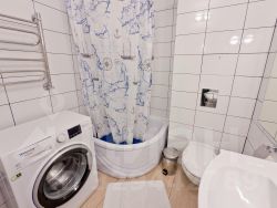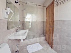 Ванная комната с душевой кабиной. В ванной комнате мансардное окно. в некоторых номерах - стиральная машина.