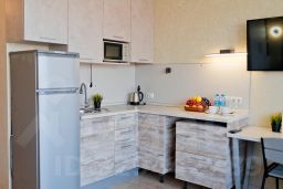 Кухонный уголок: холодильник, СВЧ, чайник, чашки, раковина.