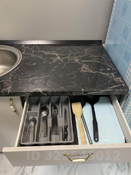 Кухня- плита, микропечь, холодильник, посуда и кухонные принадлежности, диван-кровать.