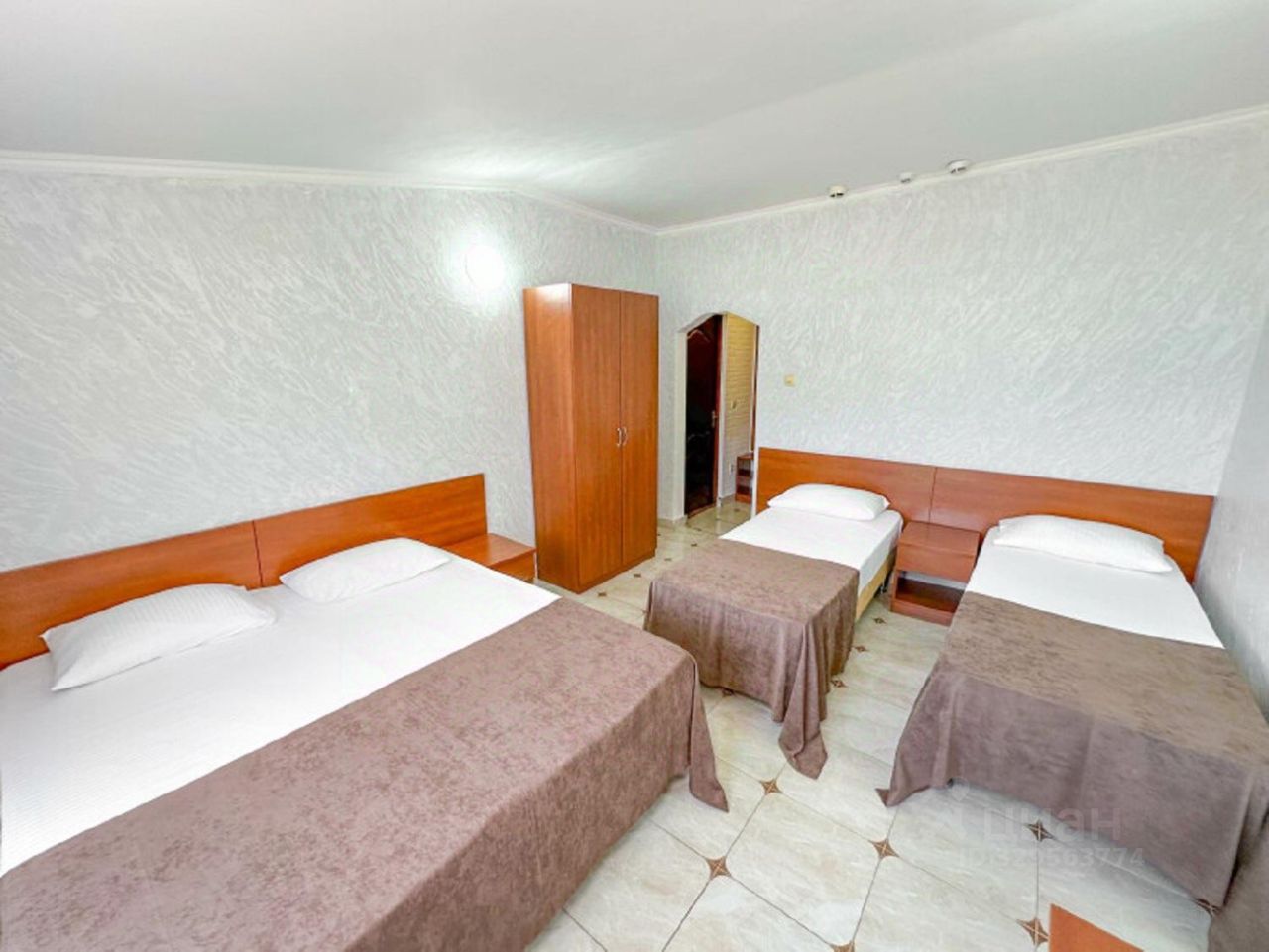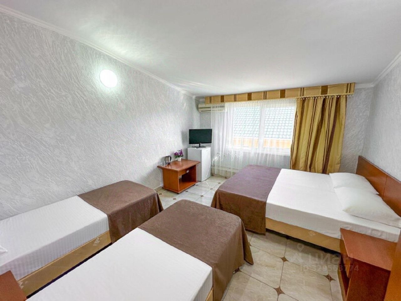 Стандартный четырехместный номер это номер для 4-х взрослых - с двуспальной кроватью и двумя односпальными кроватями. Расположение номера на четвертом этаже. Напольное покрытие - кафель. В номере имеется холодильник, телевизор, кондиционер сплит-система, фен, стаканы. В номере собственный санузел, душ. Номера комплектуются набором полотенец на каждого гостя (банное, лицевое и полотенце для ног). В ванной комнате есть жидкое мыло. В номере есть балкон. В номере без предоставления дополнительного места и без дополнительной оплаты может проживать ребенок в возрасте до 4 лет.