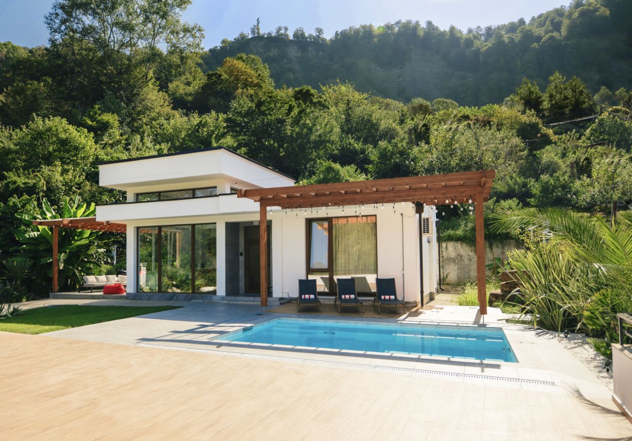Новая дизайн-вилла с 3 спальнями и панорамной гостиной в 6 минутах от пляжа. Бассейн с противотоком и невероятными видами, панорамная барбекю площадка с видом на море и горы.