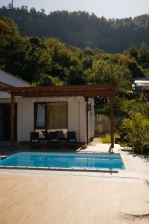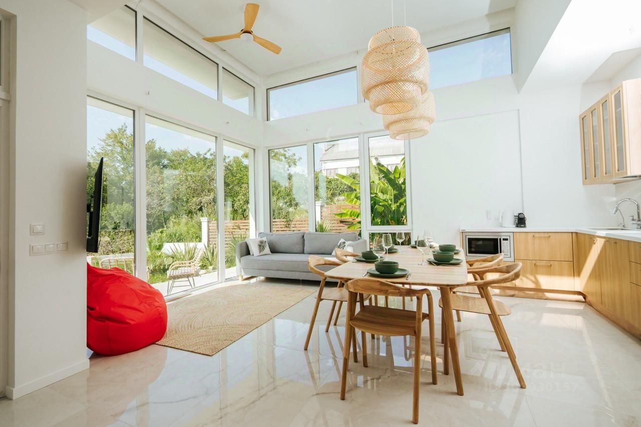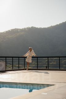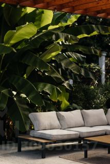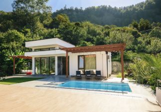 Тропическая дизайн-вилла с 3 спальнями, большой гостиной и панорамной зоной отдыха с видом на море и горы. Бассейн с противотоком и видом. Расположена в 6 минутах езды на машине от пляжа и 45-50 минутах от Горнолыжных курортов Красной Поляны в окружении собственного сада. Вокруг очень тихо и зелено.