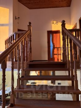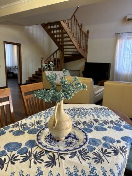Большая уютная и светлая гостиная со вторым светом , прекрасной деревянной лестницей , и видом на море . Открытая терраса с выходом из гостиной.