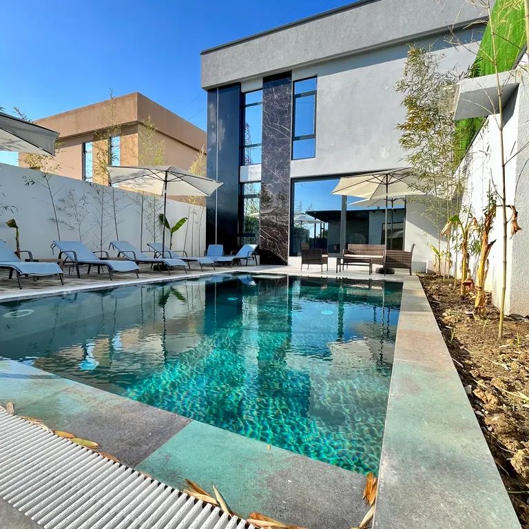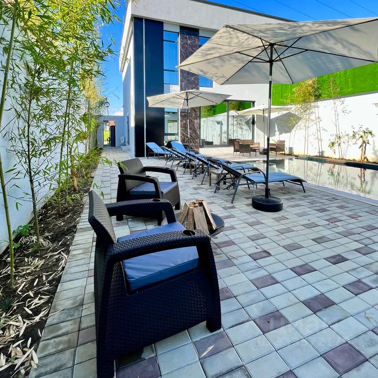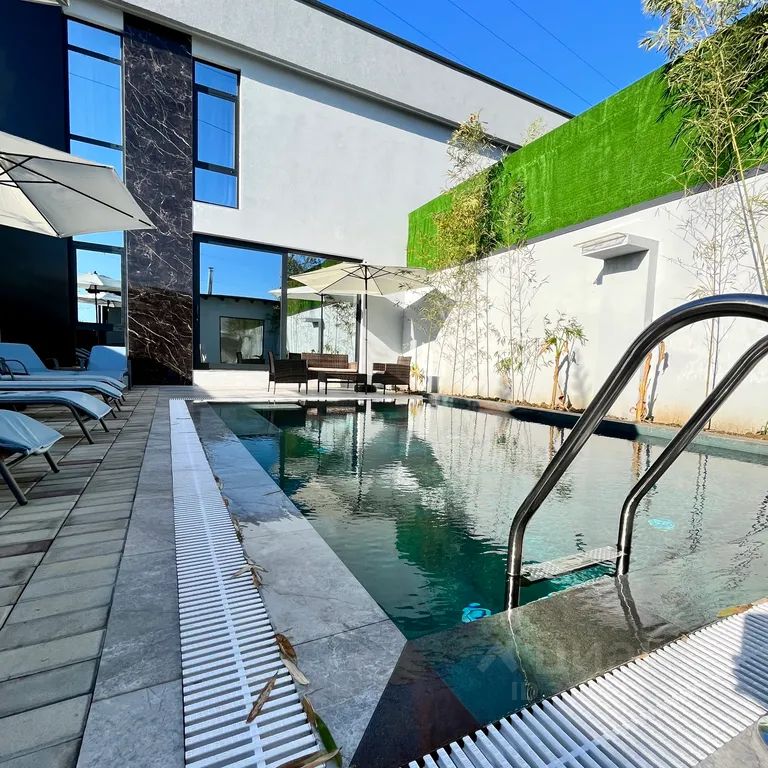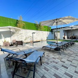 Бассейн, лежаки, зонтики