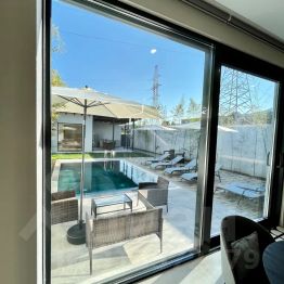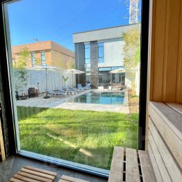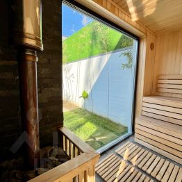 Русская баня на дровах с панорамным окном и видом на бассейн