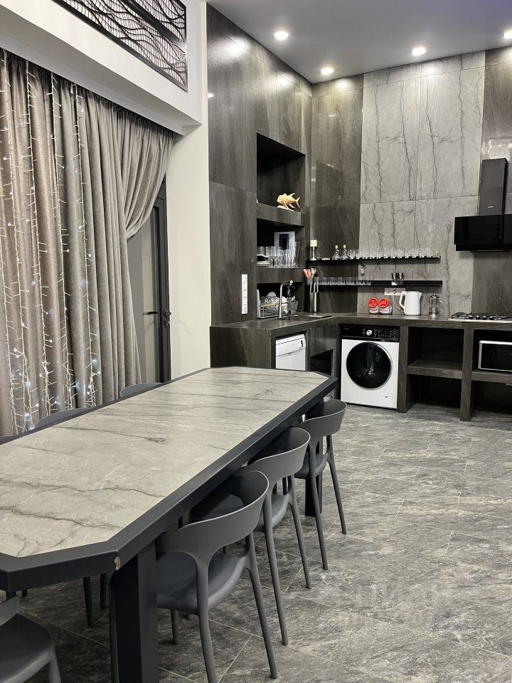 Кухня-столовая площадью 30 кв.м. (4, 6*6, 6м) в современном стиле на 10 мест. Стол 2, 4*0, 9м. Маленький не раскладной диван. Оснащение: газовая плита, раковина, столовая посуда, бокалы, стаканы, рюмки, капельная кофеварка, турки, чайник, посудомоечная и стиральная машины, большой холодильник и морозильная камера. Смарт-телевизор диагональю 65 дюймов. В гардеробной зоне есть большое зеркало, фен, гладильная доска, утюг.