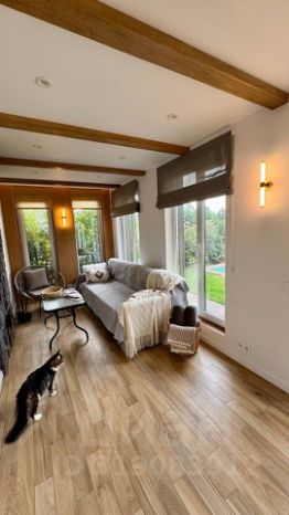В доме весь первый этаж - водяной теплый пол, без ЭМ излучений и с полной автономией управления температурой в доме круглый год, на втором этаже дубовый паркет и водяные батареи + электрический теплый пол во всех санузлах для круглогодичного использования, если хочется