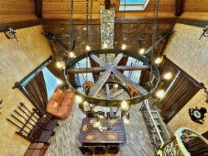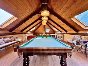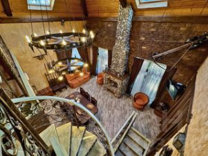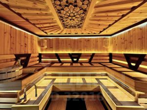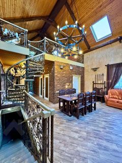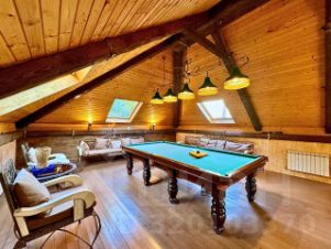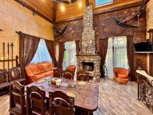Банный комплекс, на первом этаже каминный зал, сауна на дровах, небольшая кухня, санузел и ванна с витражным остеклением, на втором этаже зона отдыха с бильярдом.
