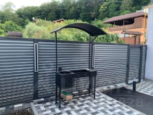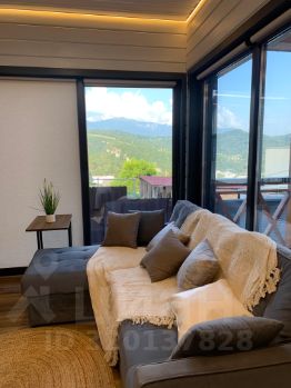 На первом этаже кухня гостиная с выходом на террасу, плюс санузел.